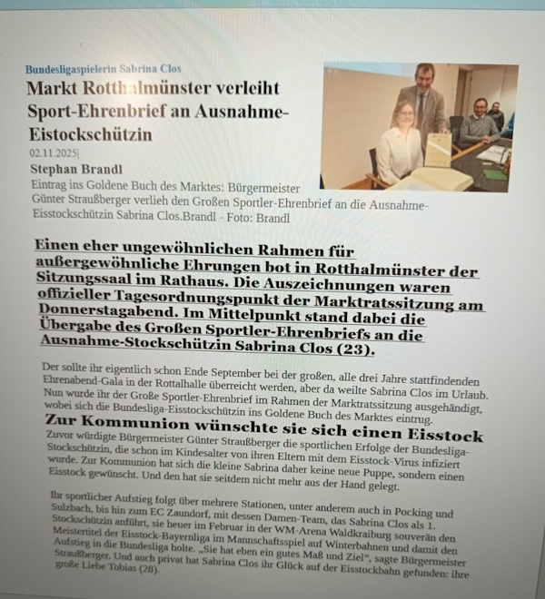 Eine besondere Ehrung wurde Sabrina Clos zuteil: Bürgermeister Straußberger verlieh ihr den Sportler-Ehrenbrief des Marktes Rotthalmünster. Wir gratulieren!!