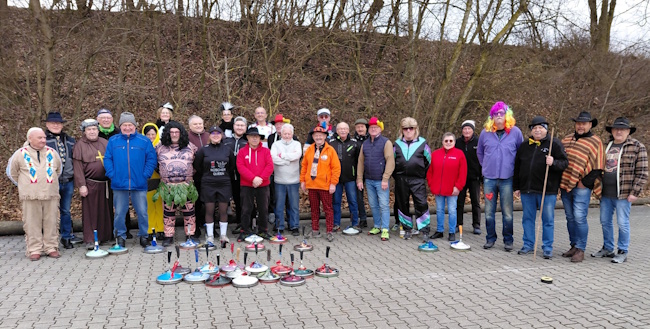 Beim diesjährigen Faschingsbradlschießen, erstmals ausgetragen am Faschingssamstag mit 30 Teilnehmern, konnten die "Blauen" um Josef Gründl (4.v.r.) bereits ihren dritten Erfolg in Folge verbuchen. Sie gingen recht schnell mit 2.0 Spielen in Führung. Dann aber holten die "Roten" mit Moar Karl Plinganser (3.v.r.) auf und lagen im entscheidenten 5. Spiel mit "Braune" vorn, den Sieg schon vor Augen. Dennoch konnten die "Blauen" wieder ausgleichen, sodaß die allerletzte Kehre die Entscheidung bringen mußte. Aber auch da hatten die "Roten" wieder zuviele Fehlschüsse und mußten die Kosten für das Bradl übernehmen. Die Revanche gibts dann aber erst im nächsten Jahr.